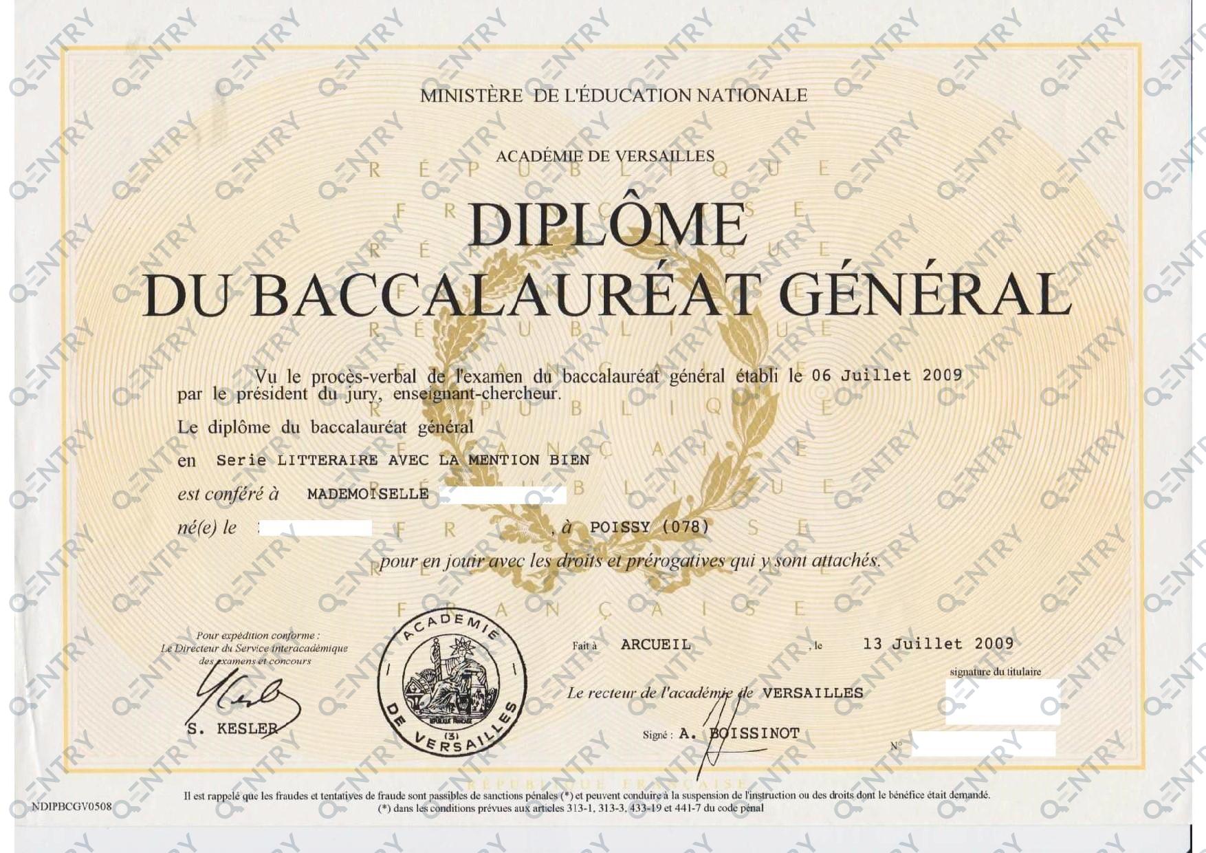 The sample here attached refers to a General secondary leaving diploma, stream L (literary). Previous secondary leaving diploma: Diplôme du Baccalauréat de l’Enseignement du Second Degré (1986-1994); Diplôme de Bachelier de l’Enseignement du Second Degré (until 1985).