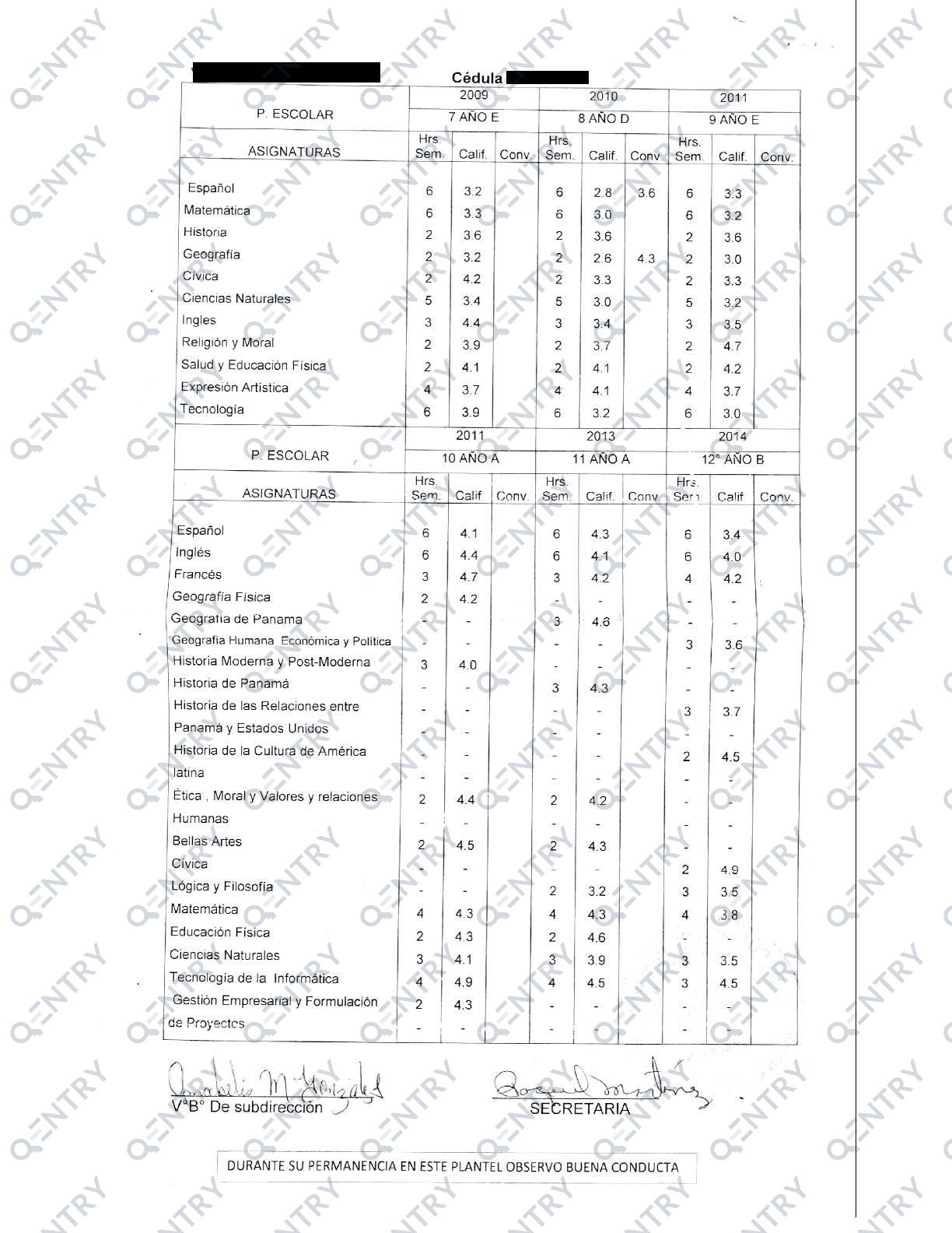 The Principal certifies that the student with Personal Identity Card (Cédula de Identidad Personal) has completed the number of years of study required at primary level, the "Básica General" or General Basic (6 years of studies - it may or may not include 2 years of pre-kinder and kinder) and at secondary level, the "Premedia" and "Media". The number of years of the secondary level " Media" depends on of the number of years approved by MEDUCA for some upper secondary schools. The 6 years are divided into 3 years of Premedia and 3 years of Media. Upon completion of the 3-year "Media" education the students obtains the Bachillerato is awarded of "Bachiller".