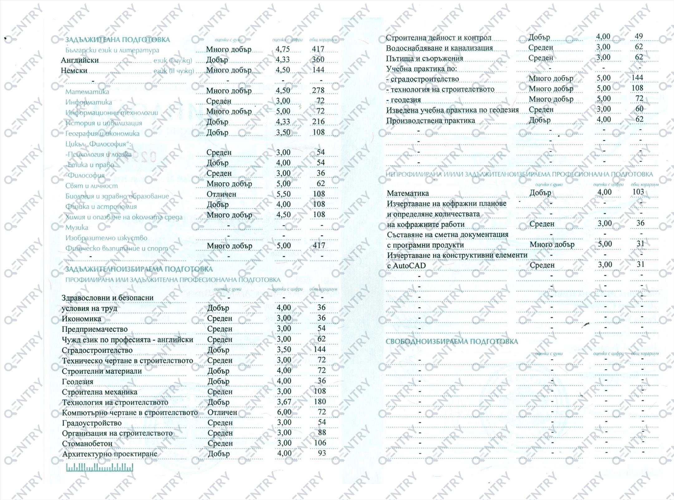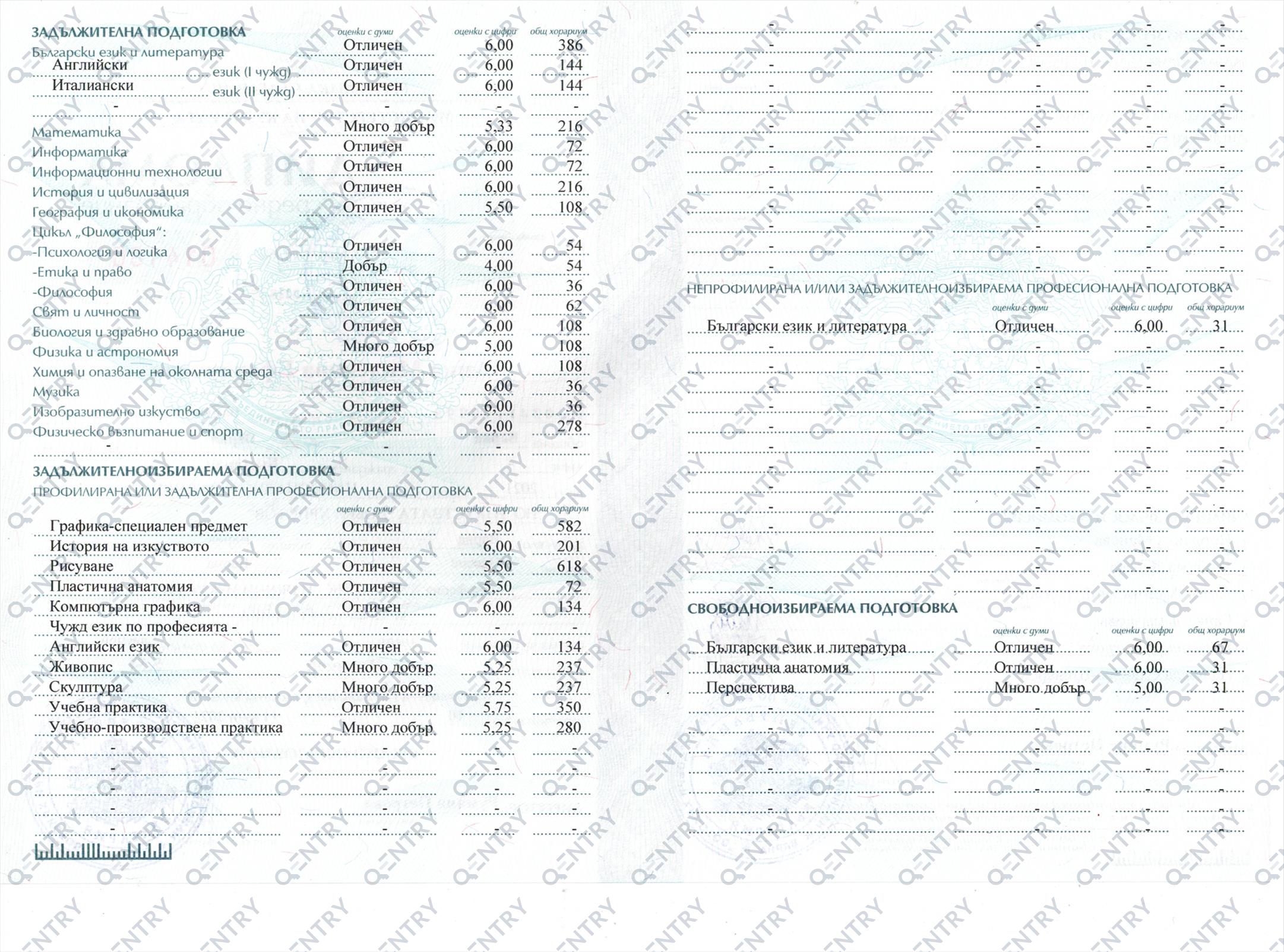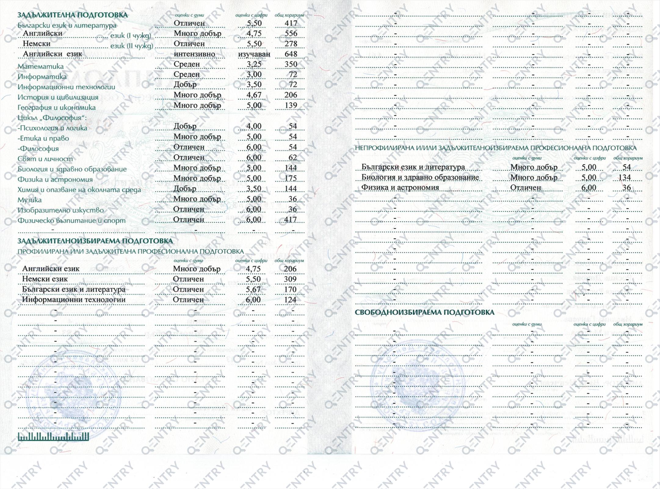 Page four of the diploma contains information about the compulsory and additionally taken State Matriculation Exams (SME). The first compulsory SME is non-elective - it is the same for all students: Bulgarian Language and Literature. The second compulsory SME is elective from a list of profiling or professional subjects. There are a number of students, which sit voluntarily on an additional SME for the purposes of extending their choices for access to higher education. The grades/marks of all cited SME is written in letters and numbers.