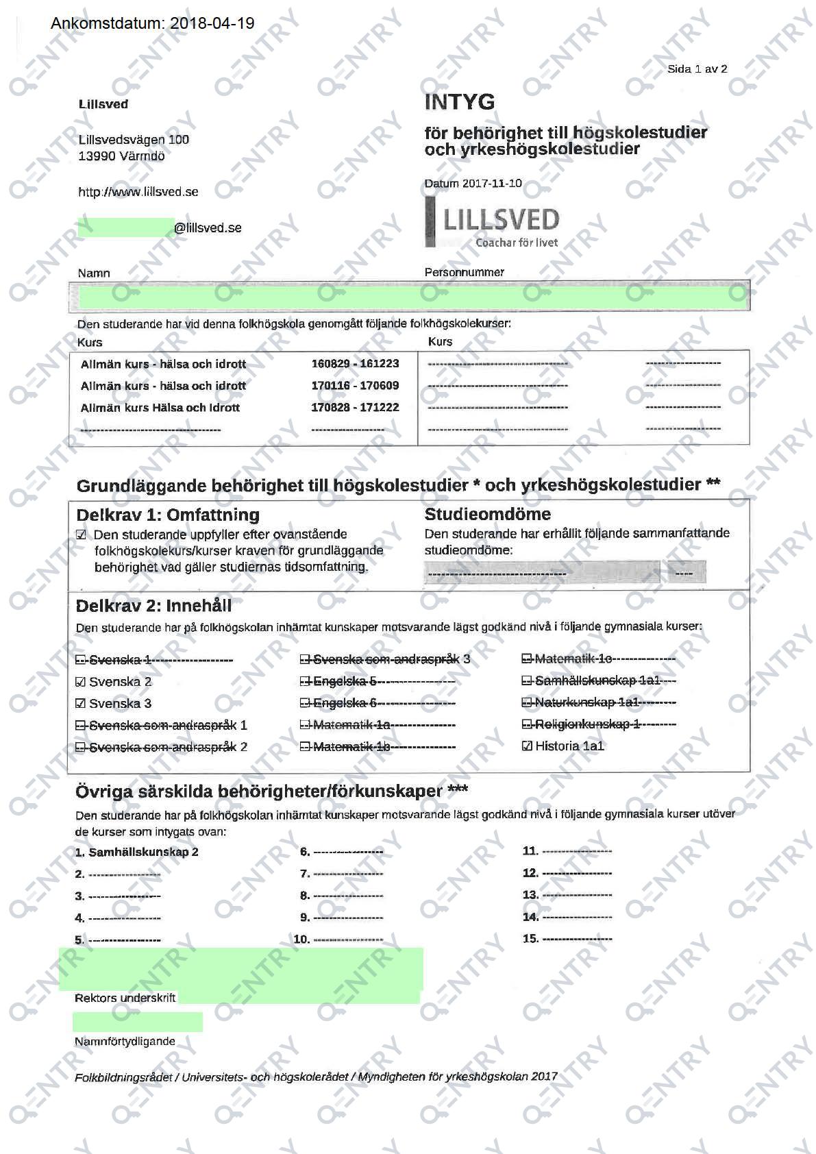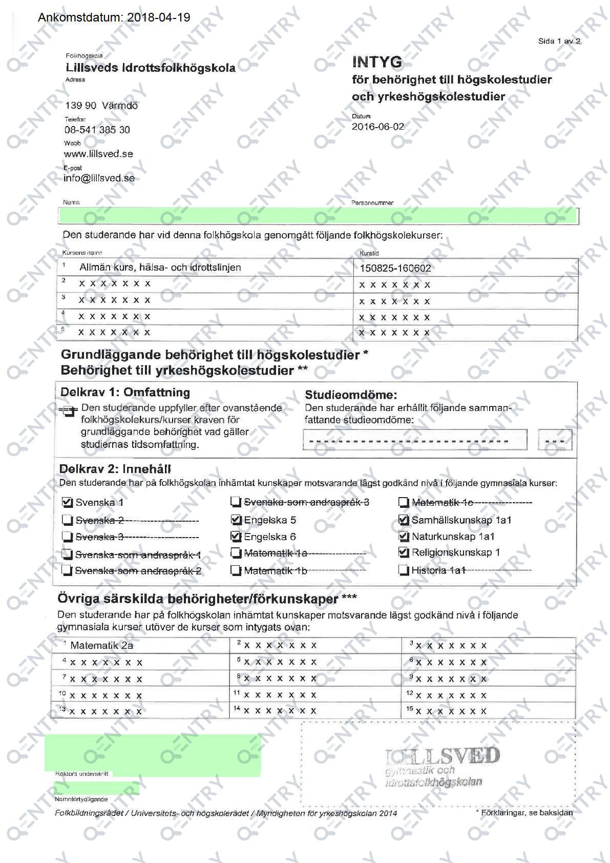 Intyg om godkänt resultat från allmän kurs på gymnasial nivå från folkhögskola
