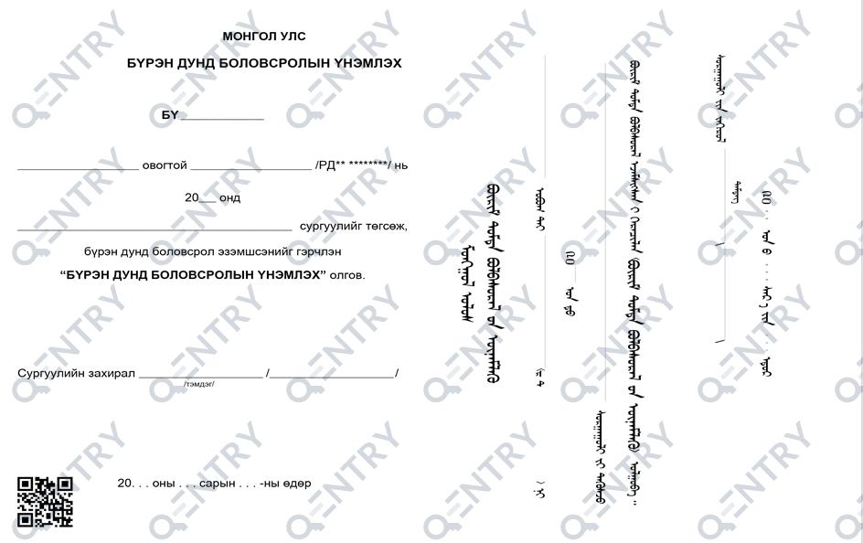 In order for the student to enter a higher education institution in Mongolia, Суурь боловсролын гэрчилгээ is required. It allows students to join higher education facilities and confirms that the student has finished 12 years of compulsory education and taken the National Examination that demonstrates students’ knowledge in 3 main subjects /Math, Mongolian or Literature study, and another subject of their choosing/. Students are also required to take the General Entrance Exam if they wish to enter a university. While students choose their exams depending on the area of study of their choice, since 2013, it has become mandatory for every student to take the Mongolian language exam. The maximum score of this exam is 800, and MECSS approves the minimum score to enter the HEI’s by Public universities and Private universities. For example, In 2019 MECSS approved minimum scores to enter the public universities to 480 scores of 800, to enter the private universities to 410 of 800 scores and the score to enter HEI’s which are located in rural areas is 400.